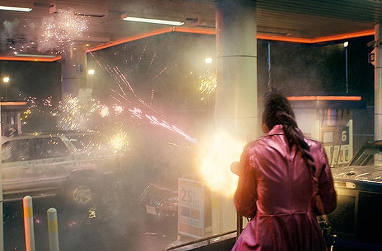 ガソリンスタンドで機関銃みたいなものを(1秒間に600発)ぶっ放すという