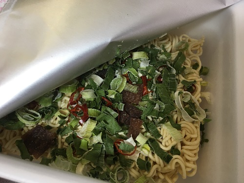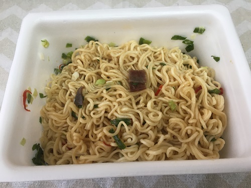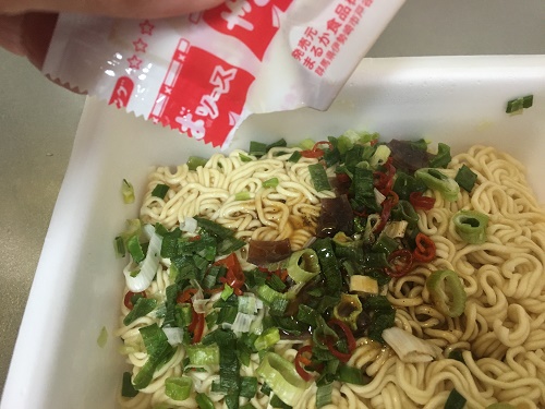 お湯を注いで3分待ってお湯を捨ててソースをかける。