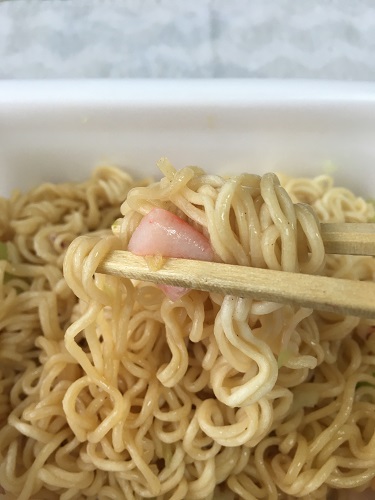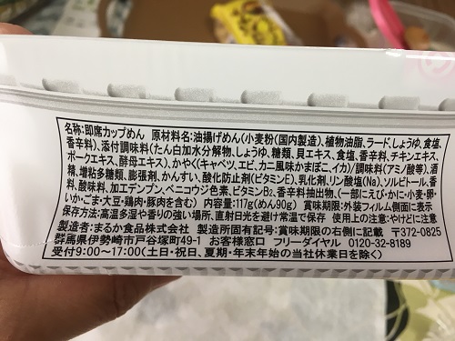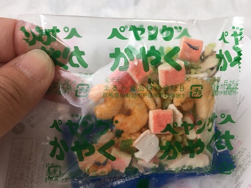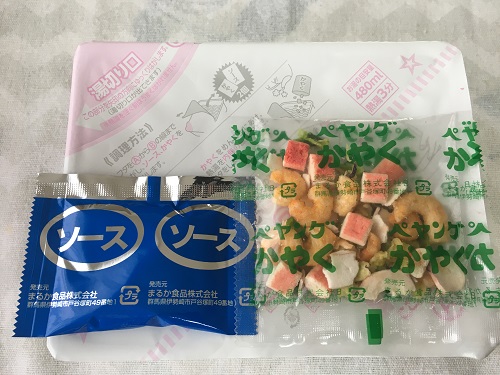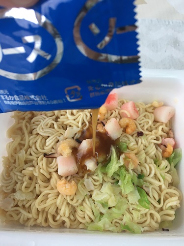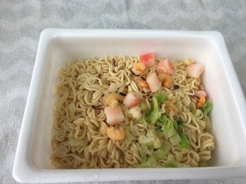 かやくはキャベツ、エビ、イカ、カニカマ。
