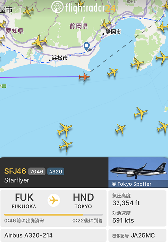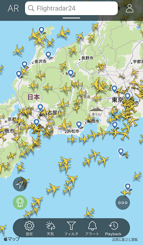 その場にいた人に「フライトレーダー24」というスマホアプリを教えてもらった。