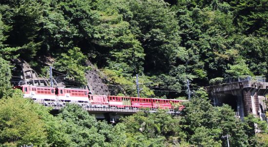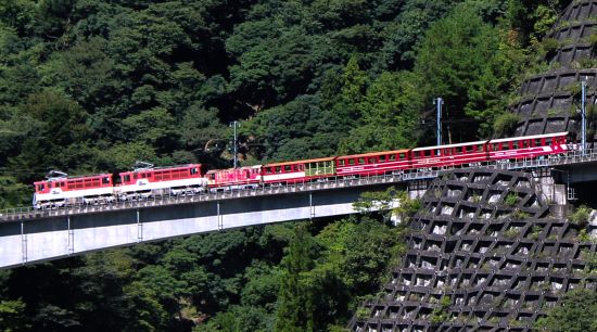 ちょうど列車が長島ダム駅でアプト式電気機関車と連結をして駅を出発し