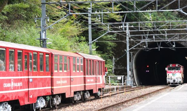 アプトいちしろ駅13:05発の井川行きと長島ダム駅13:23発千頭行き。
