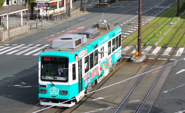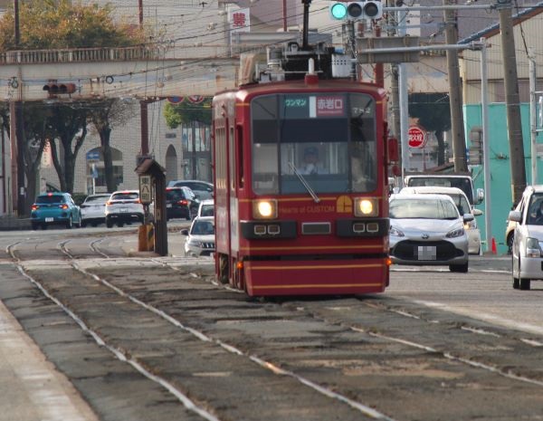 井原電停を降り、運動公園前行の路面電車を見送る。