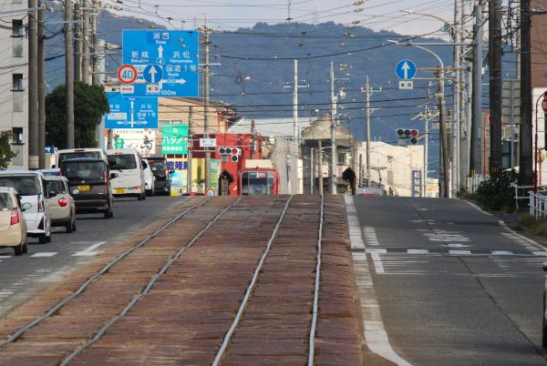 12番目の電停「井原電停」を越えるとすぐに分岐があり右に大きく曲がる。