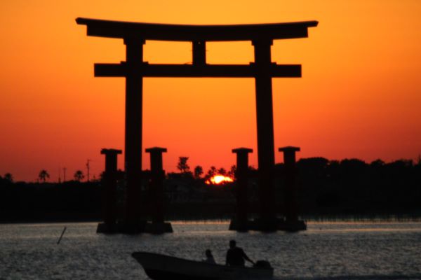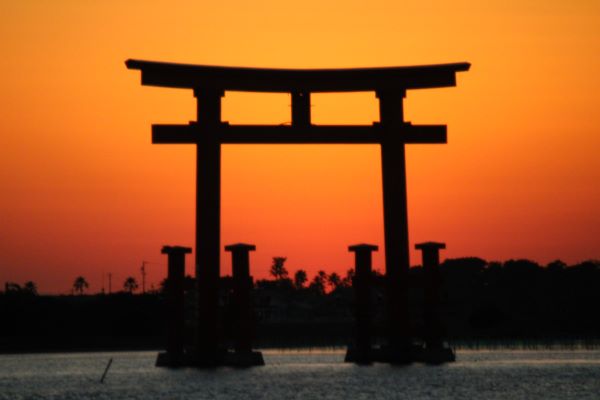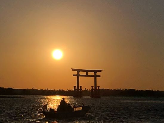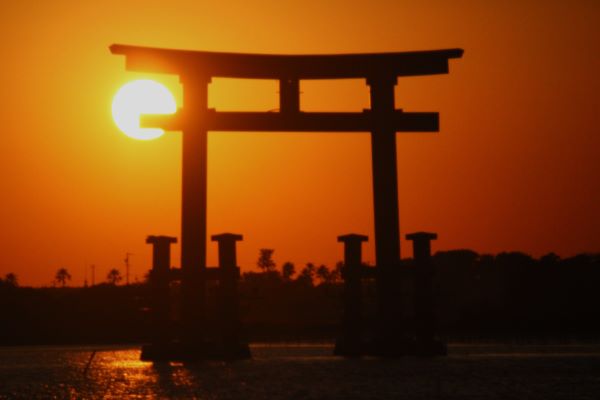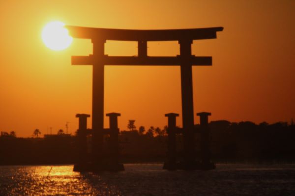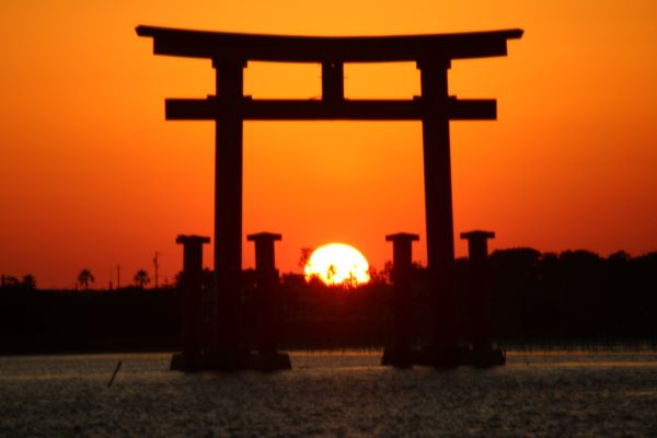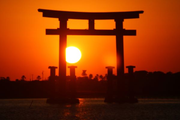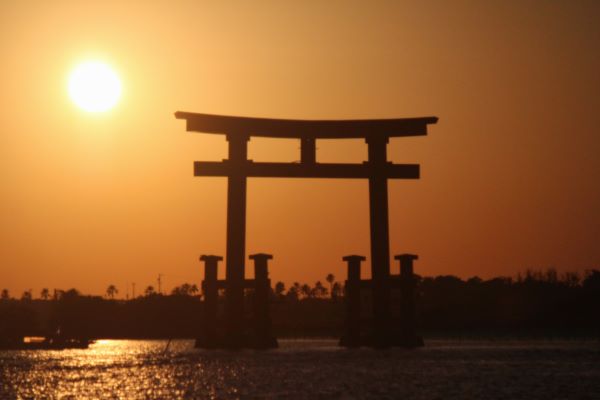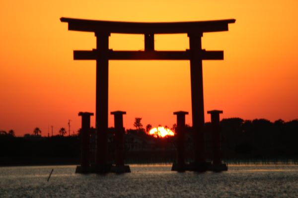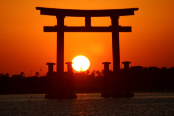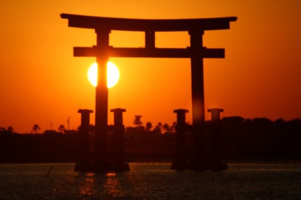 期間限定で弁天島の沖にある高さ18mの赤鳥居に沈む夕陽が見ることができる。