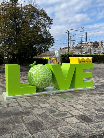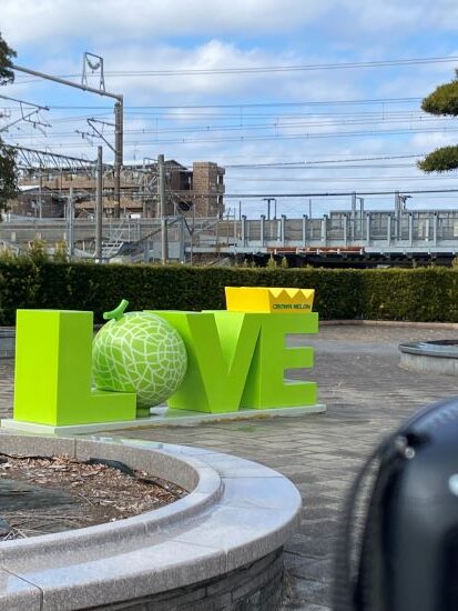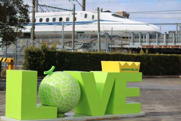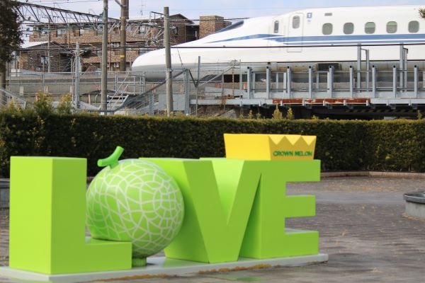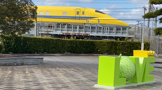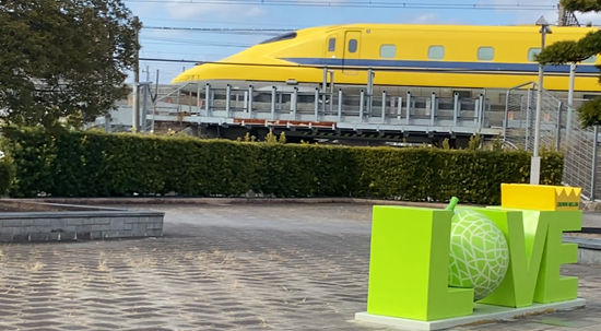 駅前広場にあるオブジェとドクターイエローが一緒に写る場所に