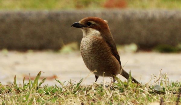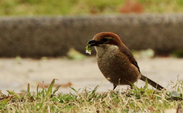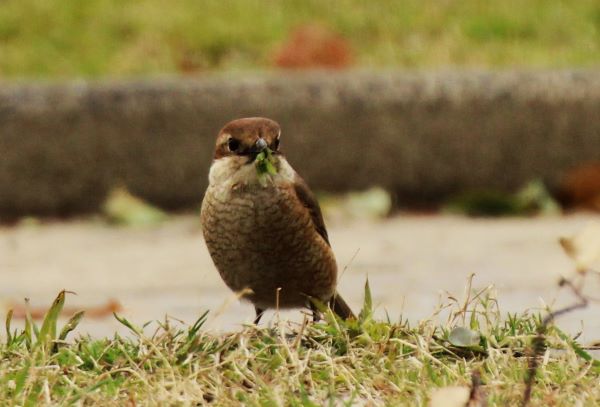 駐車場へ向かおうとしたとき、芝生の上に降りてきたメスのモズを発見。