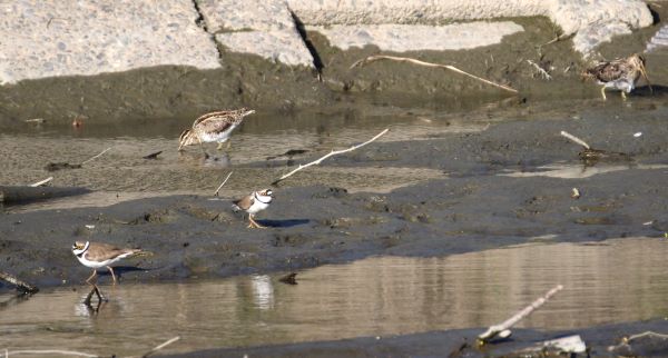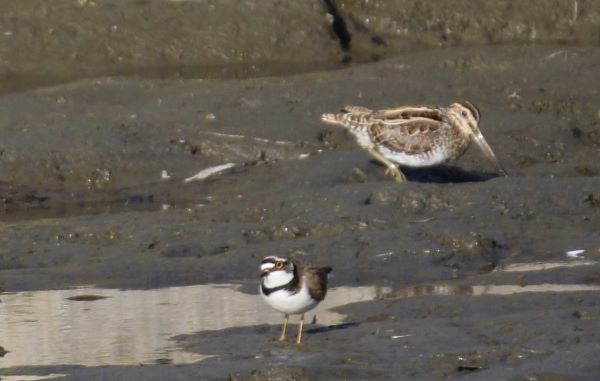 嘴がとても短いコチドリと長いタシギ(笑)