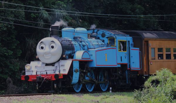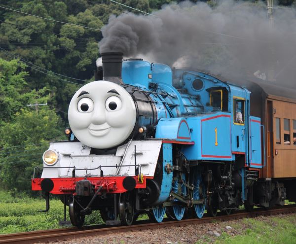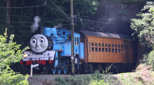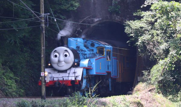 警笛が聞こえた後、「きかんしゃトーマス号1便目(下り)」がトンネルから姿を現した。