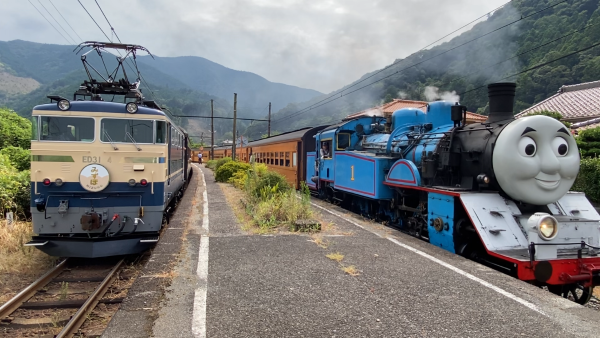 きかんしゃトーマス号とSLがこの駅ですれ違いを行っている写真がある。