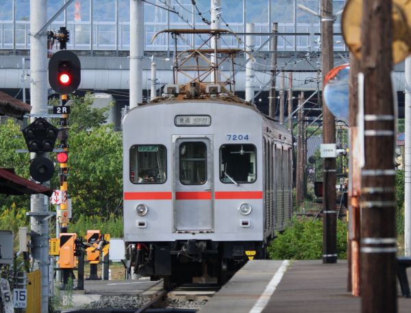 上りのきかんしゃトーマス号と下りの普通列車が駅ですれ違うので