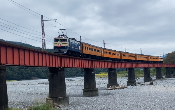 大井川第一橋梁を渡る「南アルプス1号」、編成が長い!