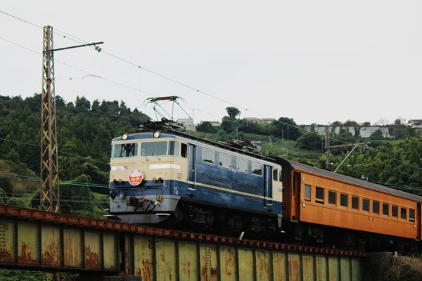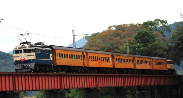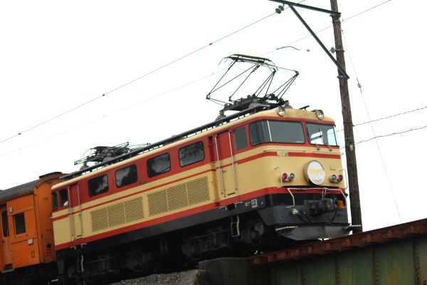 先頭はブルトレ塗装の電気機関車で最後尾はクリーム色のオレンジラインのE31形。