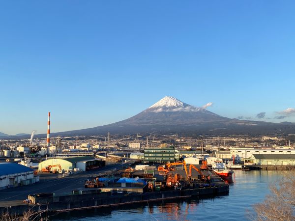 目の前には田子の浦漁港と雲一つない富士山が裾までよく見える。