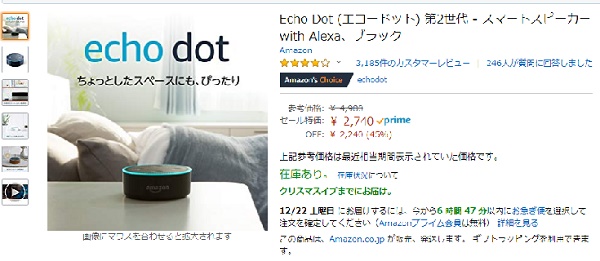 先週、「echo dot」がほぼ半額になっているのを知った。