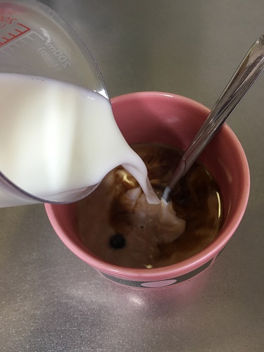 それから牛乳を150mL、氷を適当に入れてしっかり混ぜる。