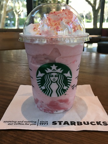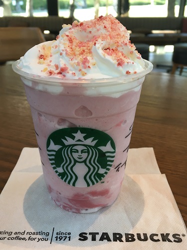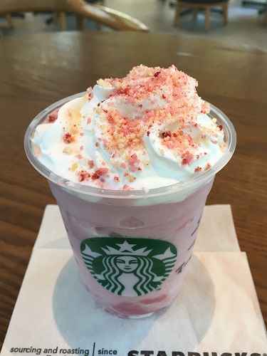色鮮やかなストロベリーパウダーで満開の桜を表現したフラペチーノ、