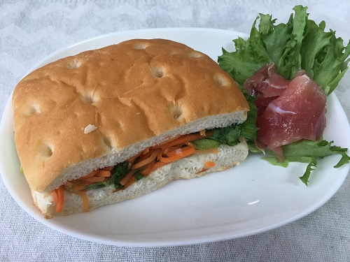 マリネしたニンジン、レタス、シーザーソースで味付けをした蒸し鶏をフォカッチャにサンド。