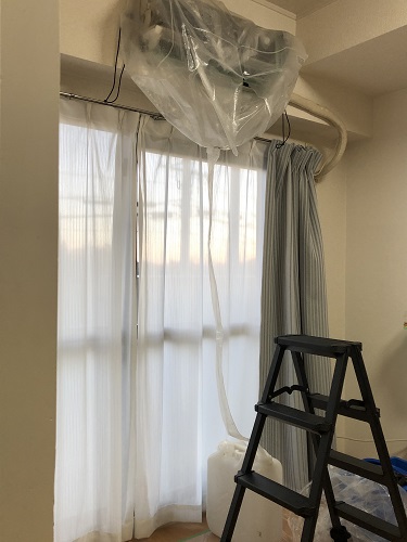 エアコンをビニールで養生し、廃液タンクを下にセットして洗浄を開始。