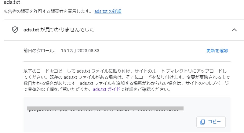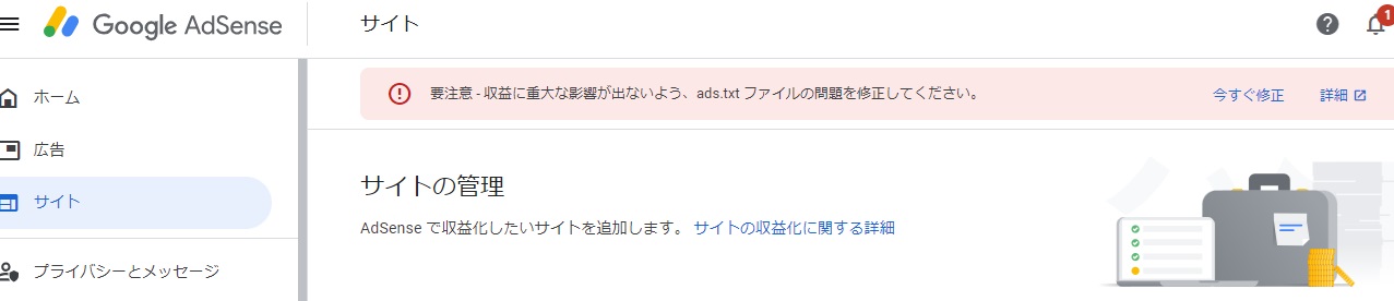 「収益に重大な影響が出ないよう、ads.txtファイルの問題を修正してください」との文が。